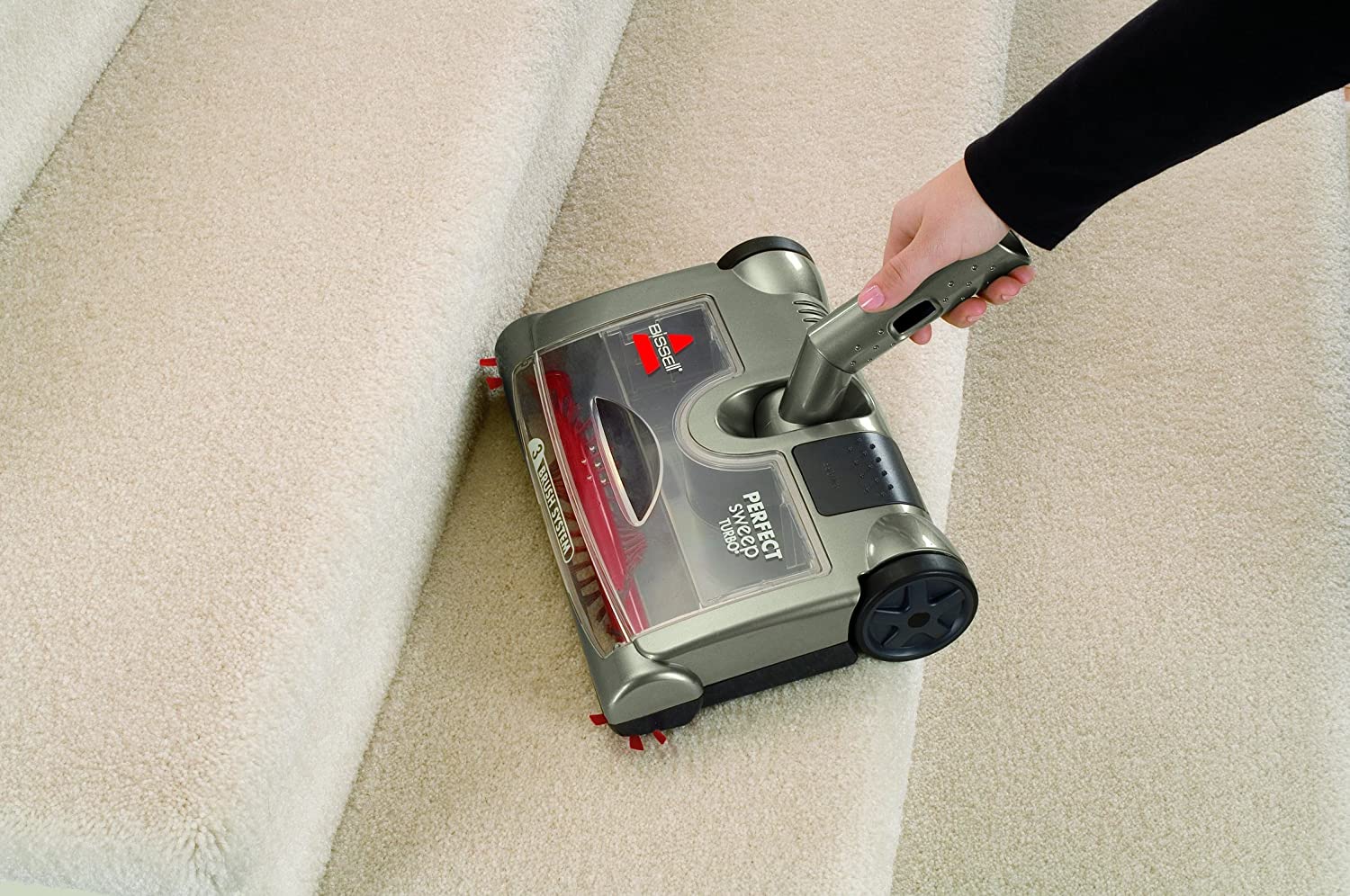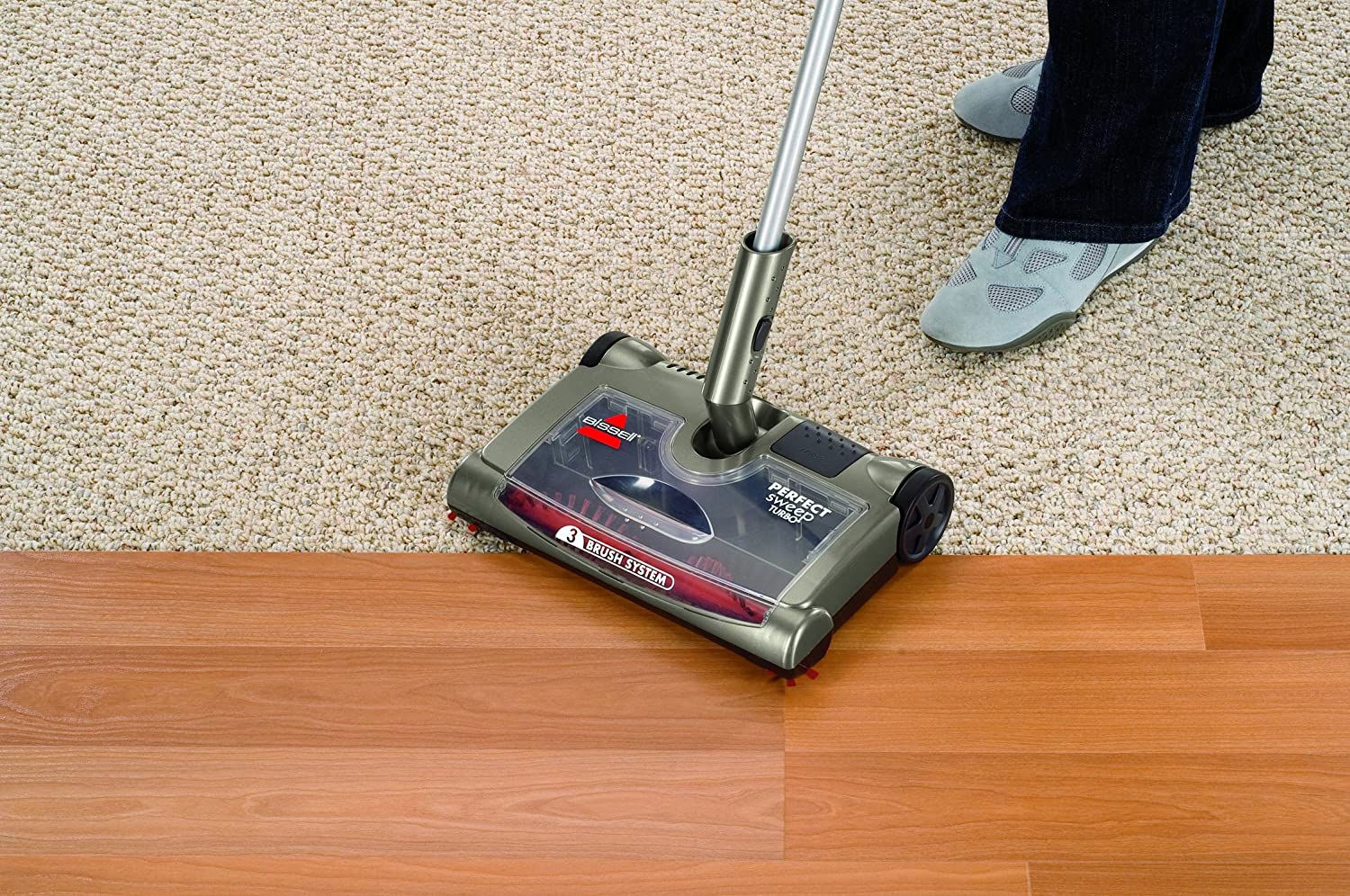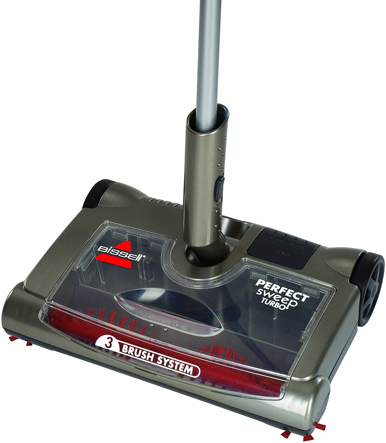 - BISSELL perfect sweep Turbo vac, 3 brush system, motorized brush roll & dual edge brushes to maximize cleaning, rechargeable, can be used on any floor surface, bagless convenience
